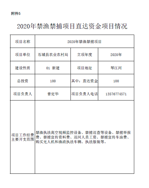 2020年禁漁退捕項目:2020年禁漁禁捕項目工作經(jīng)費主要用于禁漁執(zhí)法高空視頻監(jiān)控設(shè)備、禁捕巡查設(shè)備、禁捕舉報費、禁捕宣傳資料費、巡河人員工資、禁捕宣傳車油費、購買無人機和漁政執(zhí)法車輛、執(zhí)法服裝等開支??h財政嚴格把關(guān),資金實行報賬制,對禁漁禁捕有關(guān)的支出通過國庫集中支付方式進行撥付,有效避免了專項資金被截留、挪用等現(xiàn)象的發(fā)生,在接受上級檢查、核查或新聞媒體中沒有發(fā)生過資金違規(guī)使用的問題。(詳見附表)