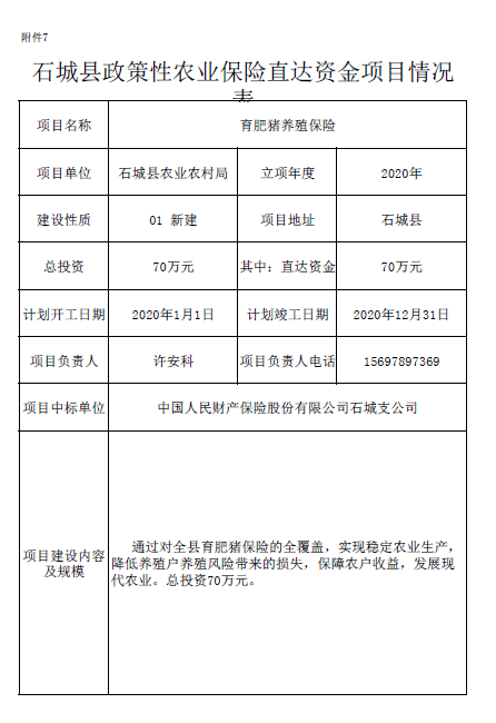農(nóng)業(yè)保險項目:根據(jù)農(nóng)戶養(yǎng)殖育肥豬的出險情況,按條款規(guī)定進行理賠;資金發(fā)放政策依據(jù)、發(fā)放標準、發(fā)放形式見附件文件及條款。(詳見附表)