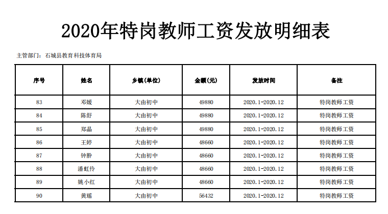大由鄉(xiāng)2020年特崗教師工資發(fā)放明細(xì)表