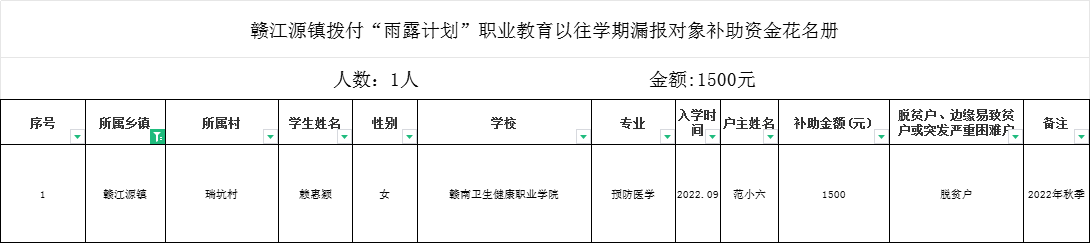 贛江源鎮(zhèn)撥付“雨露計劃”職業(yè)教育以往學期漏報對象補助資金花名冊