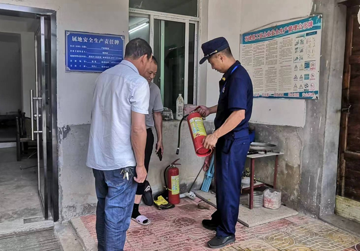 消防員帶著村干部走村入戶,重點檢查了小作坊、村民住宅、餐館和學(xué)校等場所。在加工廠里,消防員一邊檢查一邊講解:“滅火器要放在顯眼好拿的地方,看看壓力表指針是不是在綠色區(qū)域,過期的一定要換?!眮淼酱迕窦?,看到電線亂接、柴草亂堆的情況,消防員當(dāng)場指出問題,并教村民怎么整改。