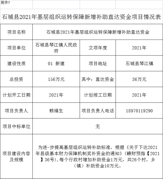 石城縣琴江鎮(zhèn)2021年財政直達資金信息公開