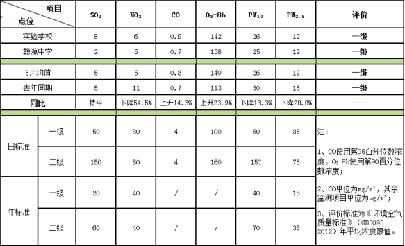 監(jiān)測(cè)點(diǎn)位共2個(gè)(實(shí)驗(yàn)學(xué)校和贛源中學(xué)),監(jiān)測(cè)項(xiàng)目為SO2、NO2、CO、O3、PM10、PM2.5,各項(xiàng)目同比情況: