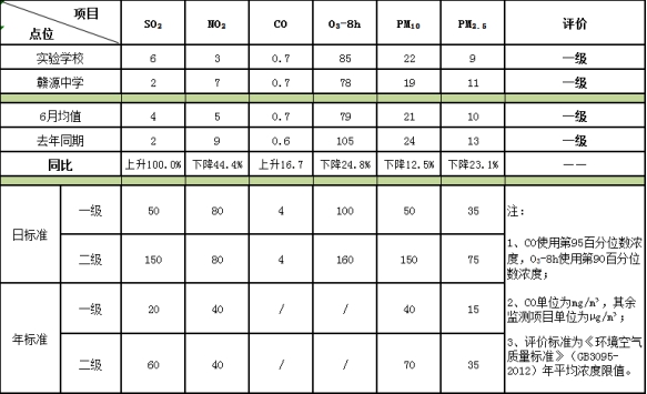 監(jiān)測(cè)點(diǎn)位共2個(gè)(實(shí)驗(yàn)學(xué)校和贛源中學(xué)),監(jiān)測(cè)項(xiàng)目為SO2、NO2、CO、O3、PM10、PM2.5,各項(xiàng)目同比情況: