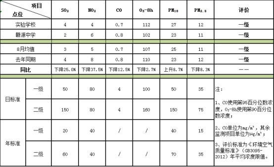監(jiān)測點位共2個(實驗學校和贛源中學),監(jiān)測項目為SO2、NO2、CO、O3、PM10、PM2.5,各項目同比情況: