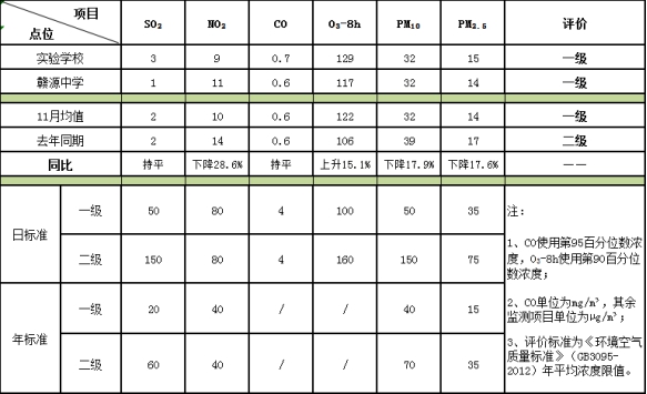 監(jiān)測點位共2個(實驗學(xué)校和贛源中學(xué)),監(jiān)測項目為SO2、NO2、CO、O3、PM10、PM2.5,各項目同比情況: