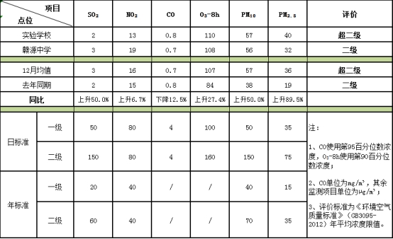 監(jiān)測點位共2個(實驗學校和贛源中學),監(jiān)測項目為SO2、NO2、CO、O3、PM10、PM2.5,各項目同比情況: