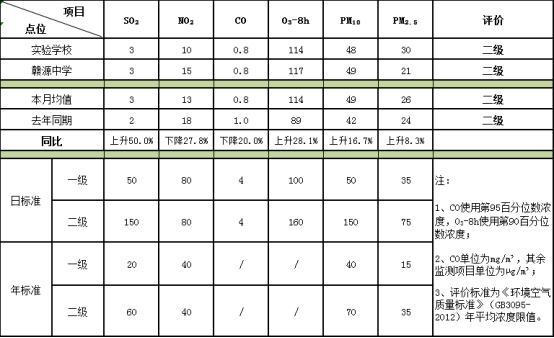 監(jiān)測點(diǎn)位共2個(gè)(實(shí)驗(yàn)學(xué)校和贛源中學(xué)),監(jiān)測項(xiàng)目為SO2、NO2、CO、O3、PM10、PM2.5,各項(xiàng)目同比情況: