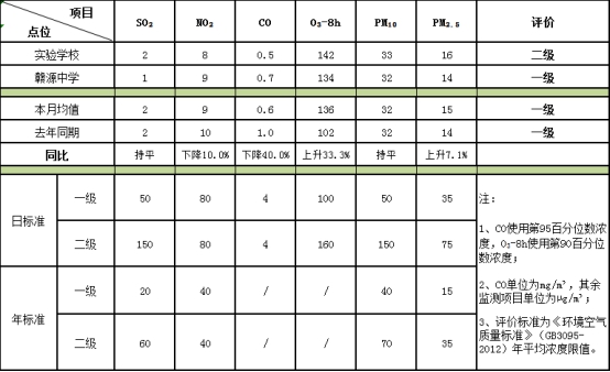 監(jiān)測點位共2個(實驗學校和贛源中學),監(jiān)測項目為SO2、NO2、CO、O3、PM10、PM2.5,各項目同比情況: