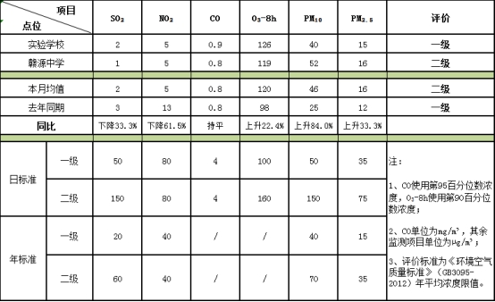 監(jiān)測點(diǎn)位共2個(gè)(實(shí)驗(yàn)學(xué)校和贛源中學(xué)),監(jiān)測項(xiàng)目為SO2、NO2、CO、O3、PM10、PM2.5,各項(xiàng)目同比情況: