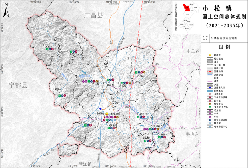 文化設(shè)施主要建設(shè)鎮(zhèn)級(jí)標(biāo)準(zhǔn)性文化活動(dòng)中心及村級(jí)多功能文化活動(dòng)室,滿足居民的休閑娛樂(lè)生活;教育設(shè)施保留小松中學(xué)、小松中心小學(xué)、石田小學(xué)和桐江小學(xué),以及加強(qiáng)普惠性幼兒園或托兒所建設(shè);醫(yī)療衛(wèi)生設(shè)施主要根據(jù)醫(yī)療資源需求保留鎮(zhèn)級(jí)中心衛(wèi)生院,提升村級(jí)衛(wèi)生室服務(wù)水平,推進(jìn)衛(wèi)生信息化建設(shè);社會(huì)福利設(shè)施為保留小松鎮(zhèn)敬老院。大力發(fā)展普惠型養(yǎng)老服務(wù)和探索互助抱團(tuán)養(yǎng)老模式,推動(dòng)養(yǎng)老事業(yè)和養(yǎng)老產(chǎn)業(yè)協(xié)同發(fā)展。