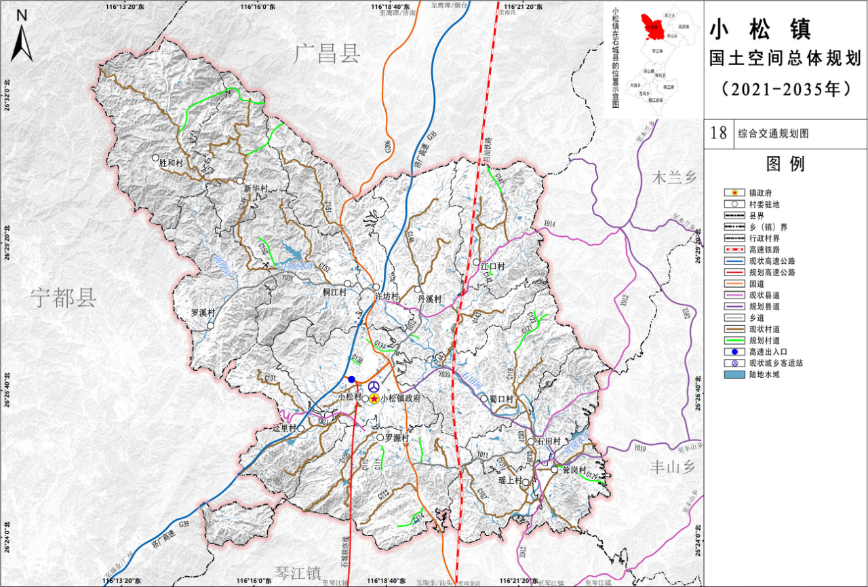 預(yù)留昌汕高速鐵路廊道;現(xiàn)狀南北向濟(jì)廣高速和規(guī)劃石城聯(lián)絡(luò)線形成小松鎮(zhèn)對(duì)外快速通道。