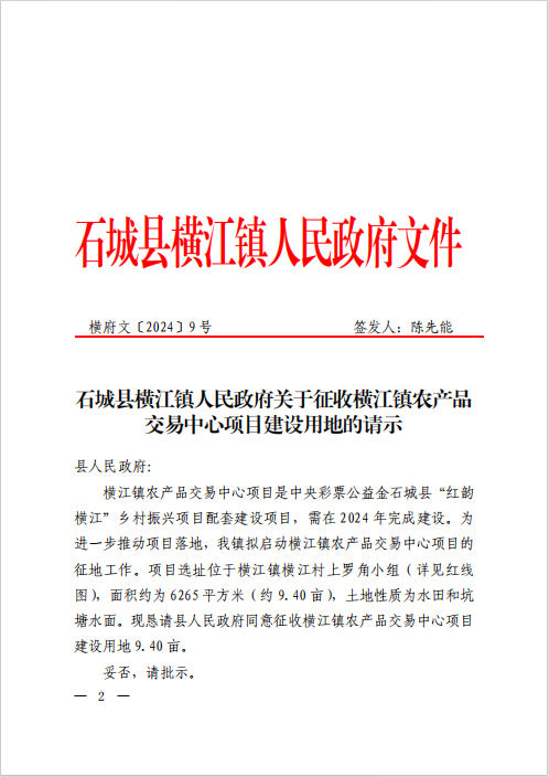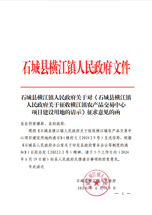 石城縣橫江鎮(zhèn)人民政府關于對《石城縣橫江鎮(zhèn)人民政府關于征收橫江鎮(zhèn)農(nóng)產(chǎn)品交易中心項目建設用地的請示》征求意見的函