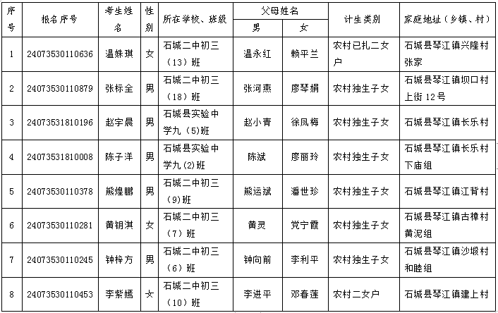 琴江鎮(zhèn)2024年農(nóng)村二女戶不再生育和農(nóng)村獨(dú)生子女家庭子女優(yōu)惠加分對(duì)象名單