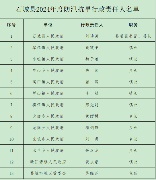 為做好2024年防汛抗旱工作,切實(shí)履行防汛抗旱責(zé)任,推動(dòng)防汛抗旱各項(xiàng)任務(wù)有效落實(shí),根據(jù)防汛抗旱工作要求,現(xiàn)將《石城縣2024年度防汛抗旱行政責(zé)任人名單》公示如下: