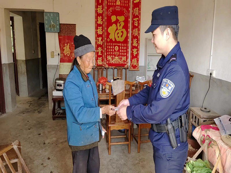 2023年12月6日上午,琴江派出所民輔警在梳理近期無人認(rèn)領(lǐng)的居民身份證中發(fā)現(xiàn),有一張身份證的辦理人陳某已耄耋之齡,且家住琴江鎮(zhèn)杉柏村,隨即民警考慮到路途遙遠(yuǎn),化身“快遞員”驅(qū)車趕往陳某家中,提供送證上門服務(wù)。