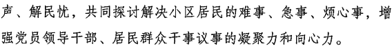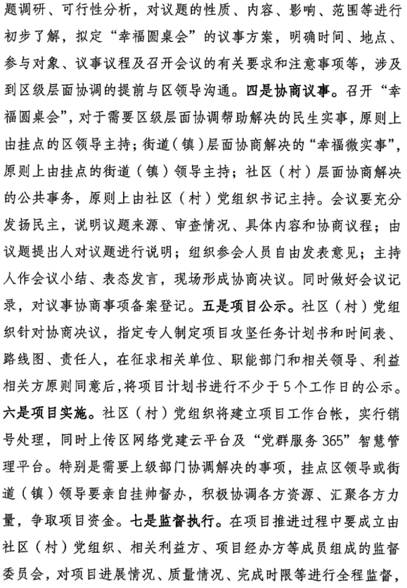二、健全協(xié)商機(jī)制,搭建協(xié)商平臺(tái)。各鄉(xiāng)鎮(zhèn)、縣城市社區(qū)管委會(huì)要指導(dǎo)各村(社區(qū))積極探索社區(qū)協(xié)商有效形式,強(qiáng)化黨建引領(lǐng),形成鄉(xiāng)鎮(zhèn)、城市社區(qū)黨委政府指導(dǎo),村(居)委會(huì)黨組織牽頭召集,駐地單位、“兩代表一委員”、物業(yè)、居民代表及利益相關(guān)方等多方參與的協(xié)商機(jī)制。充分利用現(xiàn)有的村(居)民理事會(huì)、民主懇談會(huì)、社區(qū)聽(tīng)證會(huì)等形式,拓寬協(xié)商平臺(tái)。健全議事協(xié)商制度,制定協(xié)商規(guī)則,規(guī)范協(xié)商流程。圍繞協(xié)商什么、誰(shuí)來(lái)協(xié)商、如何協(xié)商、協(xié)商結(jié)果落實(shí)與效果評(píng)估等環(huán)節(jié),形成協(xié)商的閉環(huán)流程。借助微信群、公眾號(hào)等新媒體,探索線上線下融合的協(xié)商方式,暢通群眾的需求申訴、意見(jiàn)發(fā)表、協(xié)商參與、結(jié)果監(jiān)督等渠道,努力凝聚協(xié)商合力。南昌市西湖區(qū)探索的“幸福圓桌會(huì)”社區(qū)協(xié)商機(jī)制,獲得了群眾廣泛認(rèn)可和省委黨史學(xué)習(xí)教育領(lǐng)導(dǎo)小組、省民政廳的充分肯定,各地可參考學(xué)習(xí)借鑒(見(jiàn)附件2)。
