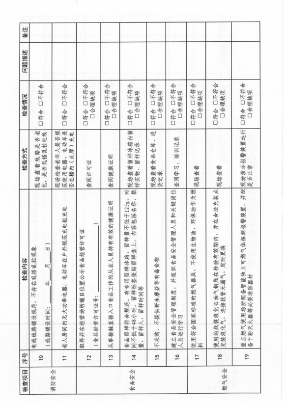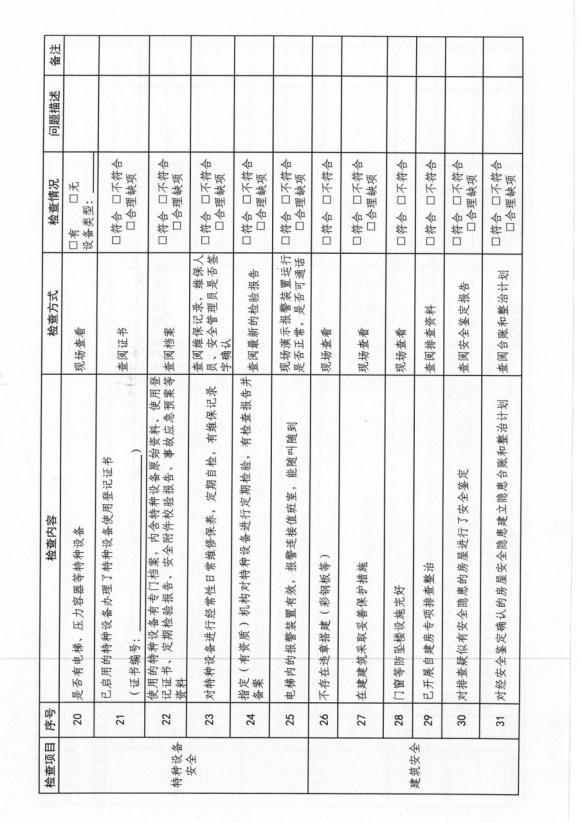 重點(diǎn)檢查消防安全、食品安全、特種設(shè)備安全、建筑安全、環(huán)境安全、防疫安全以及其他方面安全(具體內(nèi)容見(jiàn)附件2)。