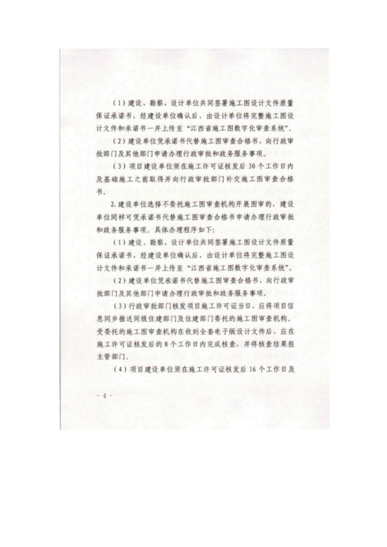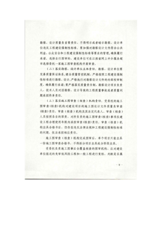 1.低風(fēng)險(xiǎn)工程取消圖審。建立低風(fēng)險(xiǎn)工程免審清單(詳見附件1),取消建設(shè)單位委托施工圖審查機(jī)構(gòu)開展圖審,實(shí)行施工圖設(shè)計(jì)文件質(zhì)量書面告知承諾制,建設(shè)、勘察、設(shè)計(jì)單位共同簽署施工圖設(shè)計(jì)文件質(zhì)量保證承諾書,由設(shè)計(jì)單位將整套完整的施工圖設(shè)計(jì)文件上傳至“江西省施工圖數(shù)字化審查系統(tǒng)”。建設(shè)單位憑承諾書申請(qǐng)辦理行政審批和政務(wù)服務(wù)事項(xiàng)。