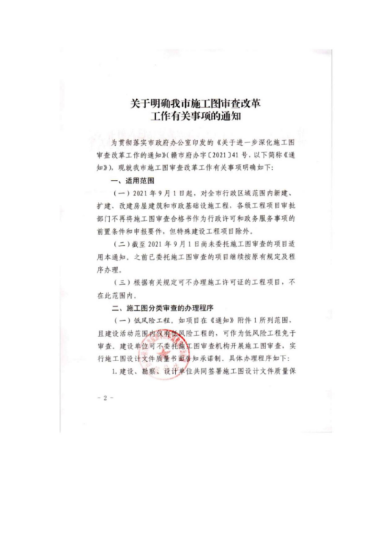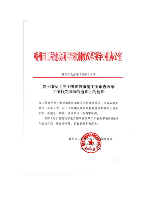 根據(jù)《贛州市人民政府辦公室關(guān)于進(jìn)一步深化施工圖審查改革工作的通知》(贛市府辦字〔2021〕41號(hào))文件精神,為貫徹落實(shí)省、市深化“放管服”改革精神,決定在確保工程質(zhì)量安全的前提下,進(jìn)一步深化我縣施工圖審查改革,提升施工圖審查效率,優(yōu)化工程建設(shè)環(huán)境?,F(xiàn)將有關(guān)事項(xiàng)通如下: