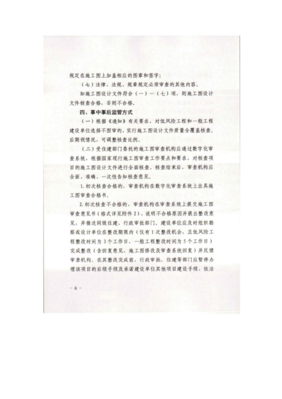 3.一般工程自主選擇圖審。除低風(fēng)險(xiǎn)工程、特殊建設(shè)工程以外的工程(詳見附件1),由建設(shè)單位自主選擇是否委托施工圖審查機(jī)構(gòu)開展施工圖設(shè)計(jì)文件審查。建設(shè)單位選擇委托施工圖審查機(jī)構(gòu)開展圖審的,實(shí)行容缺后補(bǔ)和告知承諾審批;建設(shè)單位選擇不委托施工圖審查機(jī)構(gòu)開展圖審的,憑質(zhì)量保證承諾書申請(qǐng)辦理行政審批和政務(wù)服務(wù)事項(xiàng),施工圖設(shè)計(jì)文件由住建部門組織事后核查。