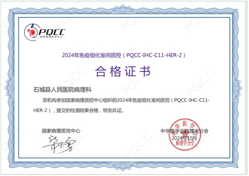 近日,縣人民醫(yī)院病理科順利通過國家病理質(zhì)控中心(PQCC)組織開展的2025年"乳腺癌病理診斷及HER-2免疫組化判讀能力驗(yàn)證計(jì)劃"和"尿路上皮癌HER2免疫組化判讀能力驗(yàn)證專項(xiàng)計(jì)劃"考核,獲得了中華醫(yī)學(xué)會(huì)病理學(xué)分會(huì)頒發(fā)的合格證書。