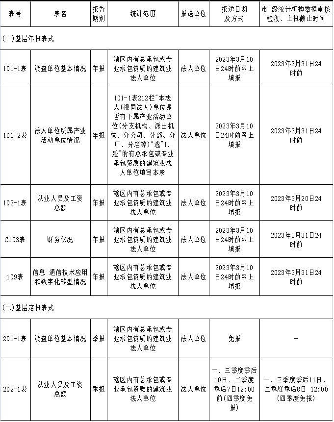 2.統(tǒng)計(jì)內(nèi)容:建筑業(yè)企業(yè)基本情況,建筑業(yè)企業(yè)所屬產(chǎn)業(yè)活動(dòng)單位基本情況,從業(yè)人員及工資總額情況,財(cái)務(wù)狀況,生產(chǎn)經(jīng)營(yíng)情況,信息通信技術(shù)應(yīng)用和數(shù)字化轉(zhuǎn)型情況等。其報(bào)送單位為具有總承包或?qū)I(yè)承包資質(zhì)等級(jí)的建筑業(yè)企業(yè)。