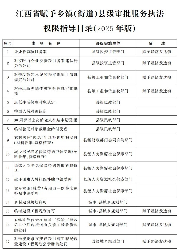 為深入貫徹落實《中共中央辦公廳 國務(wù)院辦公廳關(guān)于印發(fā)〈整治形式主義為基層減負(fù)若干規(guī)定〉的通知》等文件精神,進(jìn)一步減輕基層負(fù)擔(dān),明晰基層權(quán)責(zé),省政府決定對賦予鄉(xiāng)鎮(zhèn)(街道)縣級審批服務(wù)執(zhí)法權(quán)限有關(guān)指導(dǎo)目錄進(jìn)行優(yōu)化調(diào)整,現(xiàn)將《江西省賦予鄉(xiāng)鎮(zhèn)(街道)縣級審批服務(wù)執(zhí)法權(quán)限指導(dǎo)目錄(2025年版)》予以印發(fā)。各地各部門要提高政治站位,結(jié)合工作實際,抓好組織實施。