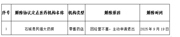 為進(jìn)一步加強我縣定點醫(yī)藥機構(gòu)管理,按照《江西省醫(yī)療保障局關(guān)于印發(fā)<江西省醫(yī)療機構(gòu)醫(yī)療保障定點管理暫行辦法><江西省零售藥店醫(yī)療保障定點管理暫行辦法>的通知》(贛醫(yī)保字〔2023〕25號)和《贛州市醫(yī)療保障局關(guān)于印發(fā)〈贛州市醫(yī)藥機構(gòu)醫(yī)療保障定點評估準(zhǔn)入和退出實施細(xì)則〉的通知》(贛市醫(yī)保字〔2023〕26號)等有關(guān)規(guī)定及醫(yī)保協(xié)議約定,經(jīng)會議研究決定,解除石城縣民強大藥房醫(yī)保服務(wù)協(xié)議,現(xiàn)將有關(guān)名單公告如下。