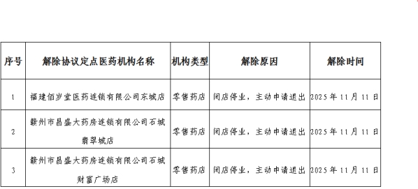 為進(jìn)一步加強(qiáng)我縣定點(diǎn)醫(yī)藥機(jī)構(gòu)管理,按照《江西省醫(yī)療保障局關(guān)于印發(fā)<江西省醫(yī)療機(jī)構(gòu)醫(yī)療保障定點(diǎn)管理暫行辦法><江西省零售藥店醫(yī)療保障定點(diǎn)管理暫行辦法>的通知》(贛醫(yī)保字〔2023]25號(hào))和《贛州市醫(yī)療保障局關(guān)于印發(fā)〈贛州市醫(yī)藥機(jī)構(gòu)醫(yī)療保障定點(diǎn)評(píng)估準(zhǔn)入和退出實(shí)施細(xì)則〉的通知》(贛市醫(yī)保字〔2023〕26號(hào))等有關(guān)規(guī)定及醫(yī)保協(xié)議約定,經(jīng)會(huì)議研究決定,解除福建佰歲堂醫(yī)藥連鎖有限公司東城店、贛州市昌盛大藥房連鎖有限公司石城翡翠城店、贛州市昌盛大藥房連鎖有限公司石城財(cái)富廣場(chǎng)店醫(yī)保服務(wù)協(xié)議,現(xiàn)將有關(guān)名單公告如下。