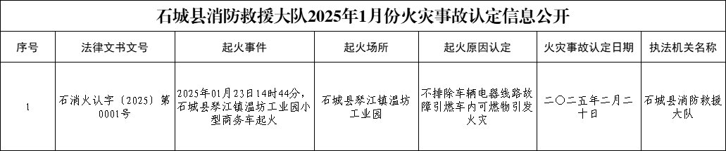 石城縣消防救援大隊2025年1月份火災(zāi)事故認(rèn)定信息公開