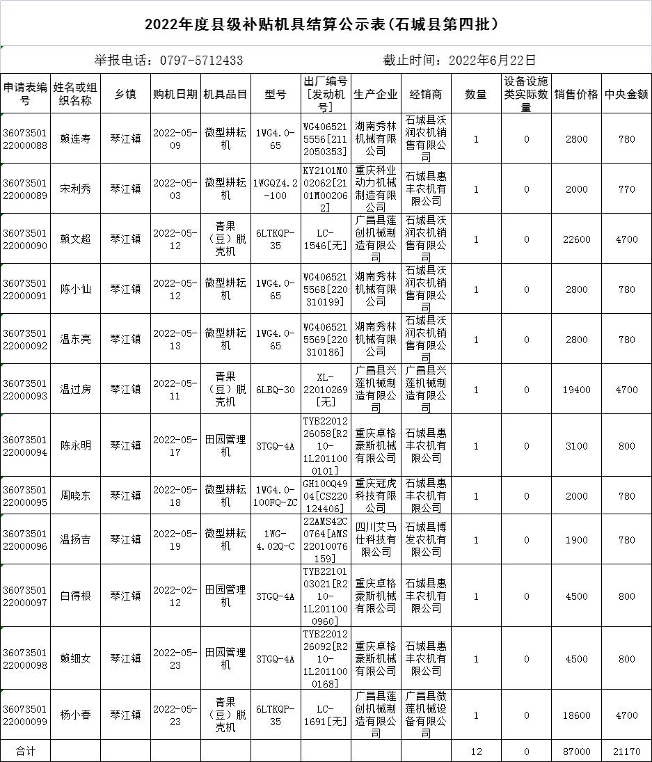 (琴江鎮(zhèn))2022年石城縣農(nóng)機購置補貼申請第四批公示表