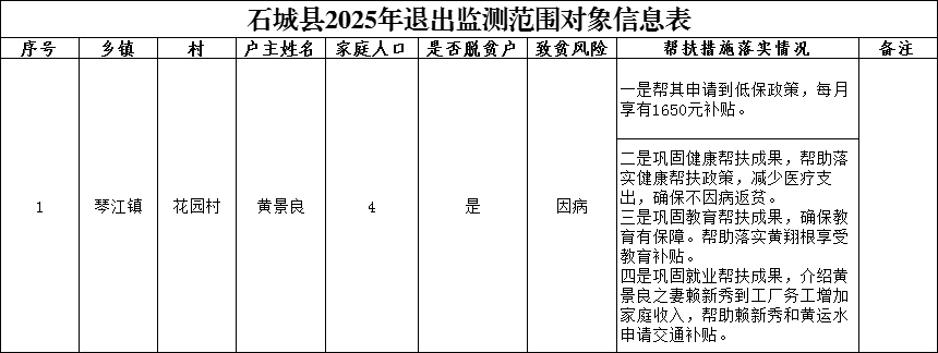 根據(jù)石城縣防貧返貧監(jiān)測預(yù)警與幫扶工作要求,縣委農(nóng)村工作領(lǐng)導(dǎo)小組對我村擬退出監(jiān)測范圍的“三類人員”進行批復(fù),同意將黃景良等7戶人退出監(jiān)測范圍,現(xiàn)予以公(名單附后)。