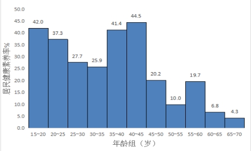 (2)不同性別、年齡段居民健康素養(yǎng)水平情況:石城縣男性居民健康素養(yǎng)水平為28.7%,女性居民健康素養(yǎng)水平為22.7%,不同性別健康素養(yǎng)水平見下圖1。40~45歲年齡組居民健康素養(yǎng)水平最高為44.5%,65歲以上的老年人健康素養(yǎng)水平最低為4.3%,各年齡組健康素養(yǎng)水平見下圖2。
