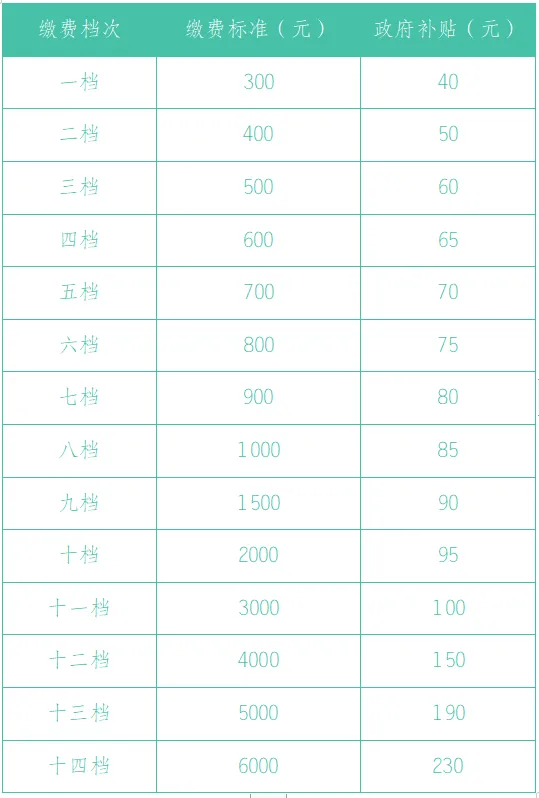 繳費檔次調(diào)整為每年300元、400元、500元、600元、700元、800元、900元、1000元、1500元、2000元、3000元、4000元、5000元、6000元等14個檔次,參保人可自主選擇檔次繳費,