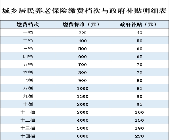 (二)繳費檔次及補貼:城居保個人繳費標(biāo)準(zhǔn)為每年300元、400元、500元、600元、700元、800元、900元、1000元、1500元、2000元、3000元、4000元、5000元、6000元共14個檔次,政府對繳納本年保費給予政府補貼。參保對象可以根據(jù)自己的經(jīng)濟(jì)承受能力選擇相應(yīng)繳費檔次,多繳多得,長繳多得。