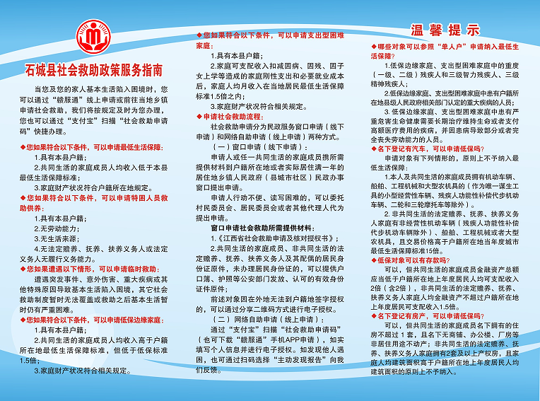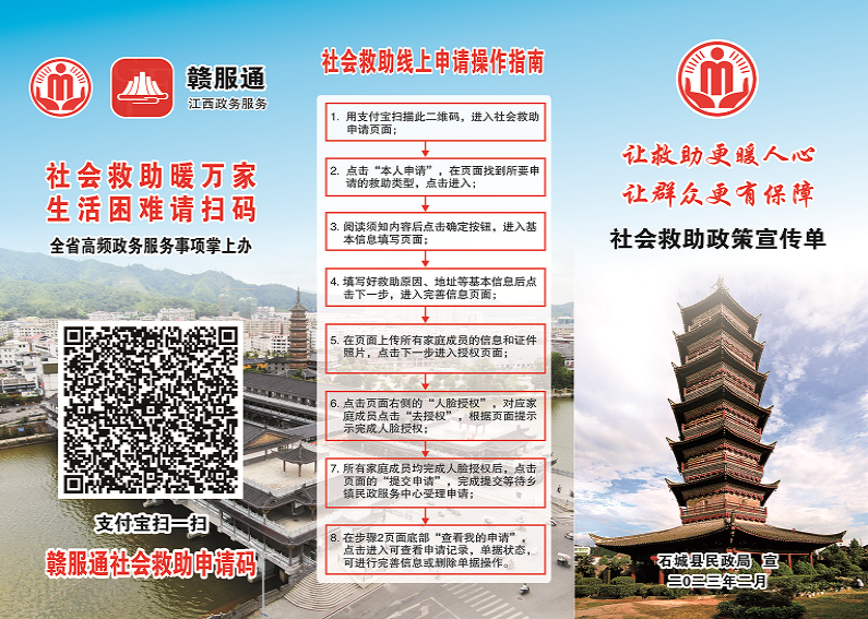 通過“支付寶”掃描“社會救助申請碼”(也可下載“贛服通”手機APP申請),如實填寫個人信息并進行電子授權(quán)。如發(fā)現(xiàn)他人遇困,也可通過掃碼選擇“主動發(fā)現(xiàn)報告”向我們反饋。