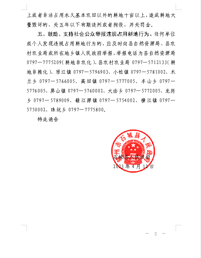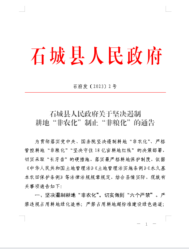 石城縣人民政府關(guān)于堅(jiān)決遏制耕地“非農(nóng)化”制止“非糧化”的通告