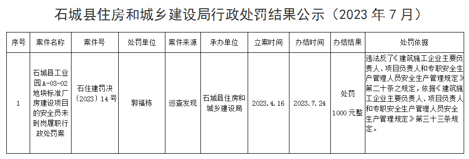 石城縣住房和城鄉(xiāng)建設局行政處罰結果公示(2023年7月)