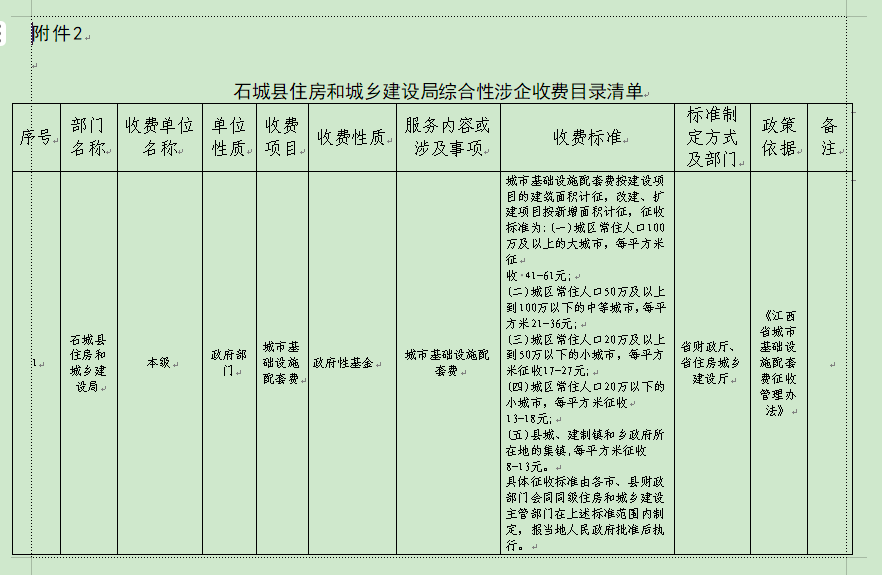 石城縣住房和城鄉(xiāng)建設(shè)局綜合性涉企收費(fèi)目錄清單