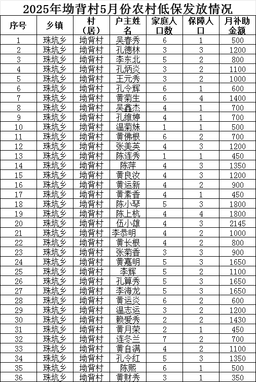 2025年坳背村5月份農(nóng)村低保發(fā)放情況
