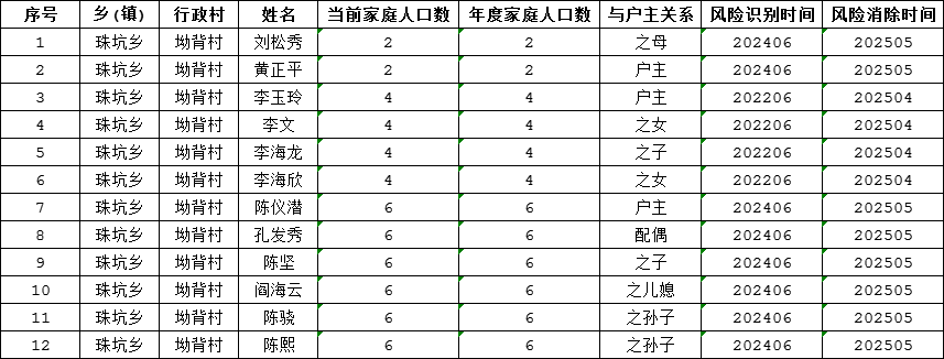 珠坑鄉(xiāng)坳背村2025年1-5月消除監(jiān)測對象名單公示