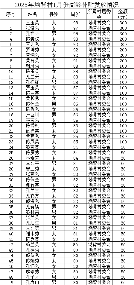 2025年坳背村1月份高齡補貼發(fā)放情況