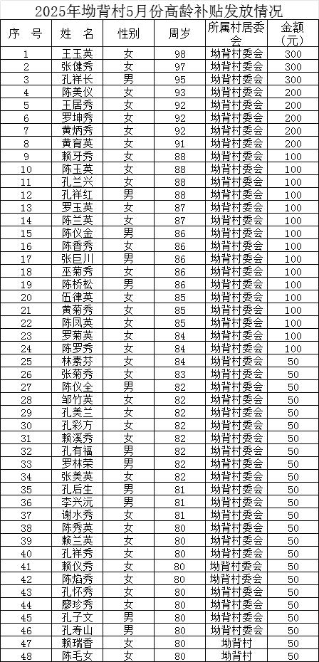 2025年坳背村5月份高齡補(bǔ)貼發(fā)放情況