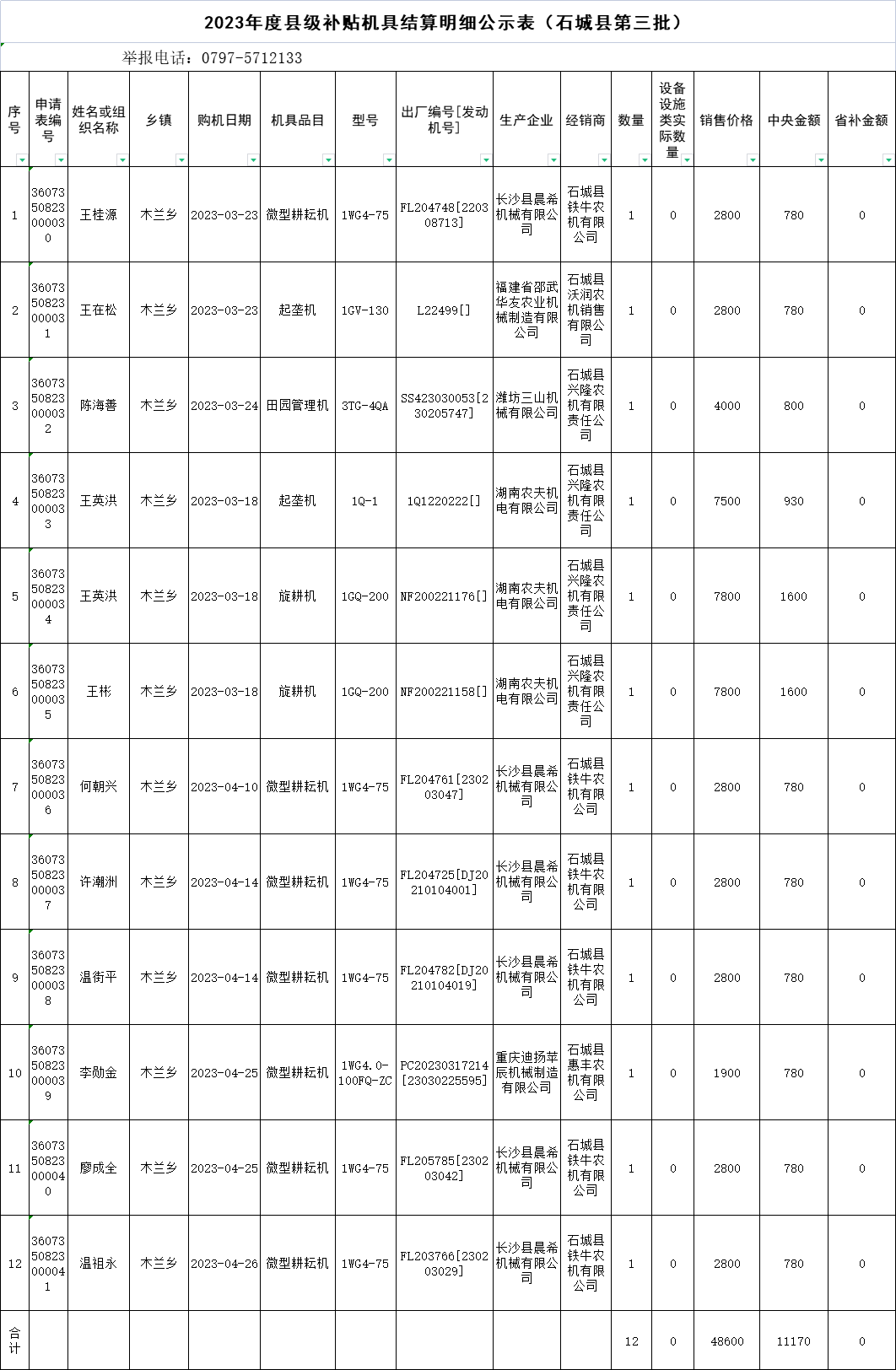 2023年度縣級補(bǔ)貼機(jī)具結(jié)算明細(xì)公示表(石城縣第三批)
