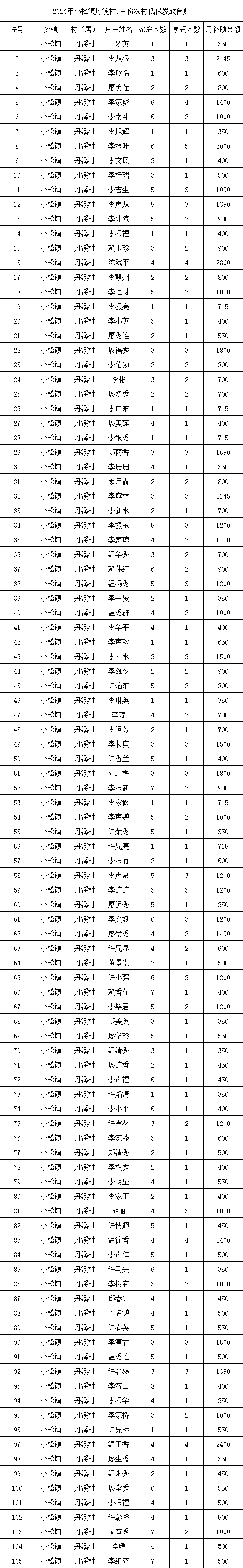 【最低生活保障】小松鎮(zhèn)丹溪村2024年5月農(nóng)村低保發(fā)放公示
