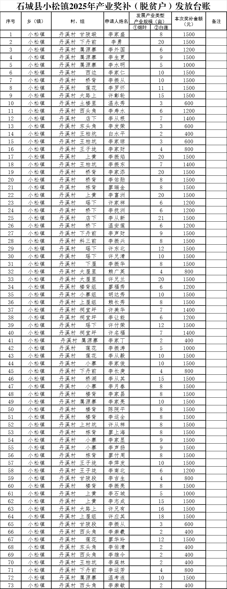 石城縣小松鎮(zhèn)丹溪村2025年第一批產業(yè)獎補發(fā)放臺賬