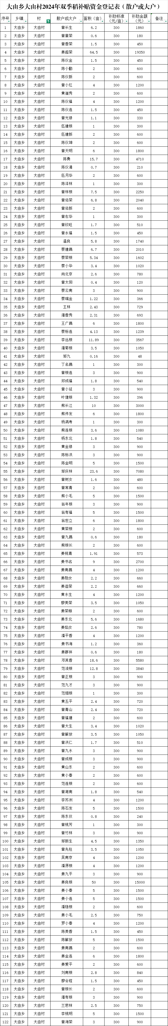 大由鄉(xiāng)大由村2024年雙季稻補(bǔ)貼資金登記表(散戶或大戶)
