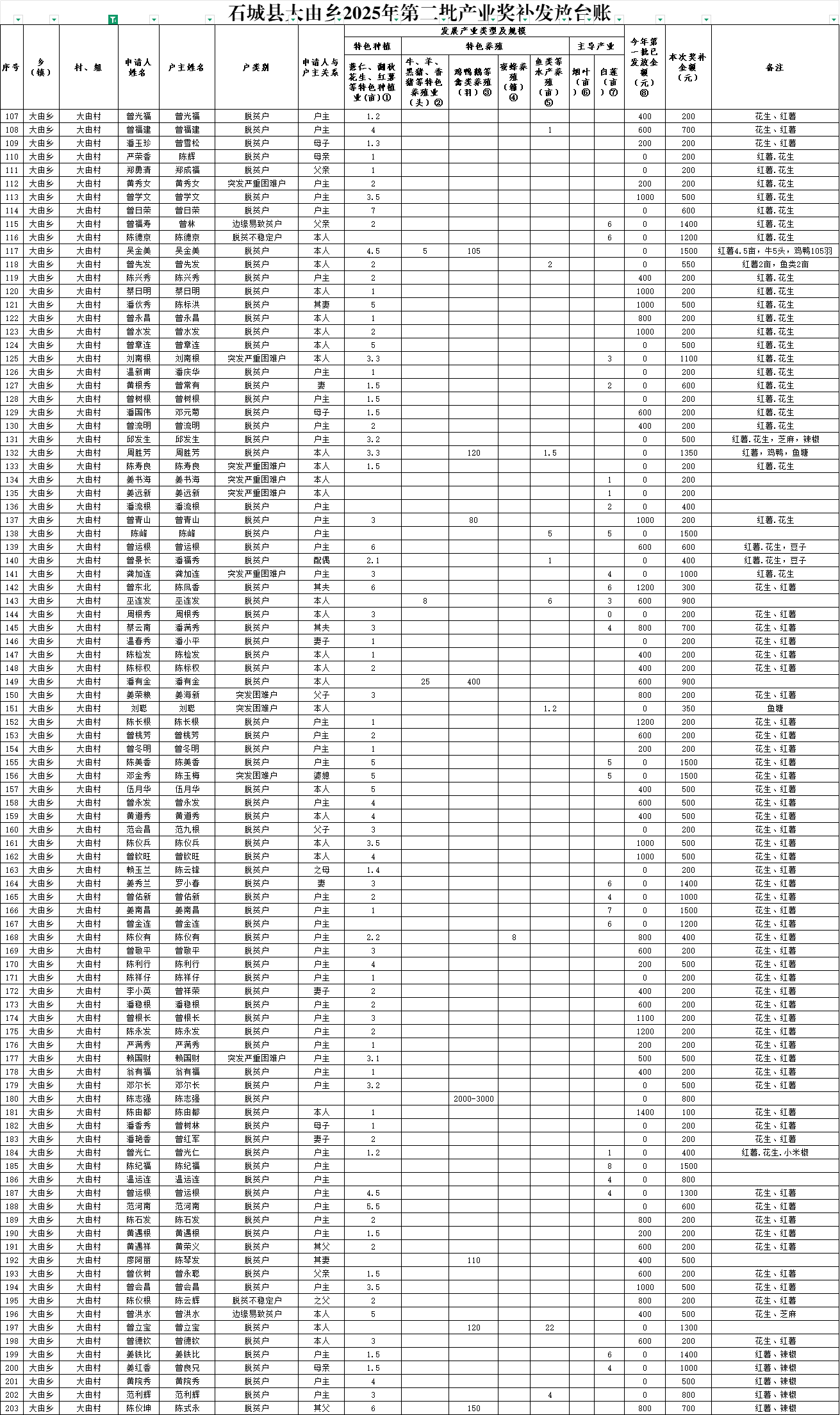石城縣大由鄉(xiāng)2025年第二批產(chǎn)業(yè)獎(jiǎng)補(bǔ)發(fā)放臺(tái)賬