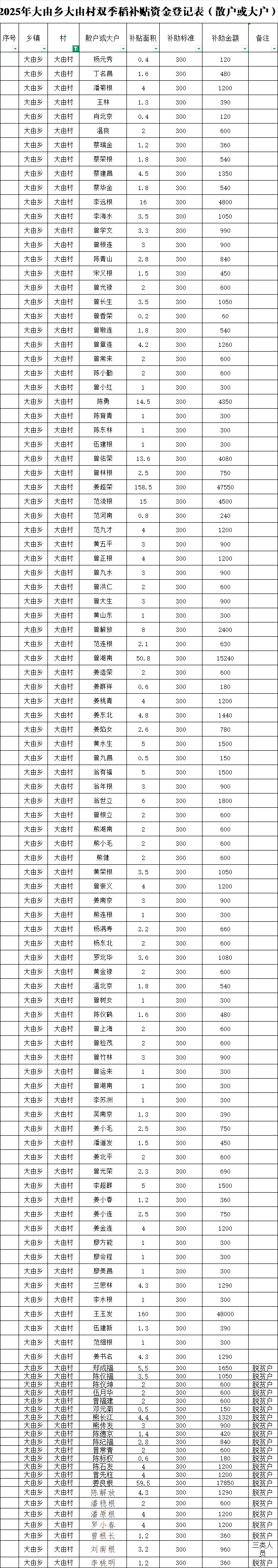 2025年大由鄉(xiāng)大由村雙季稻補(bǔ)貼資金登記表(散戶或大戶)